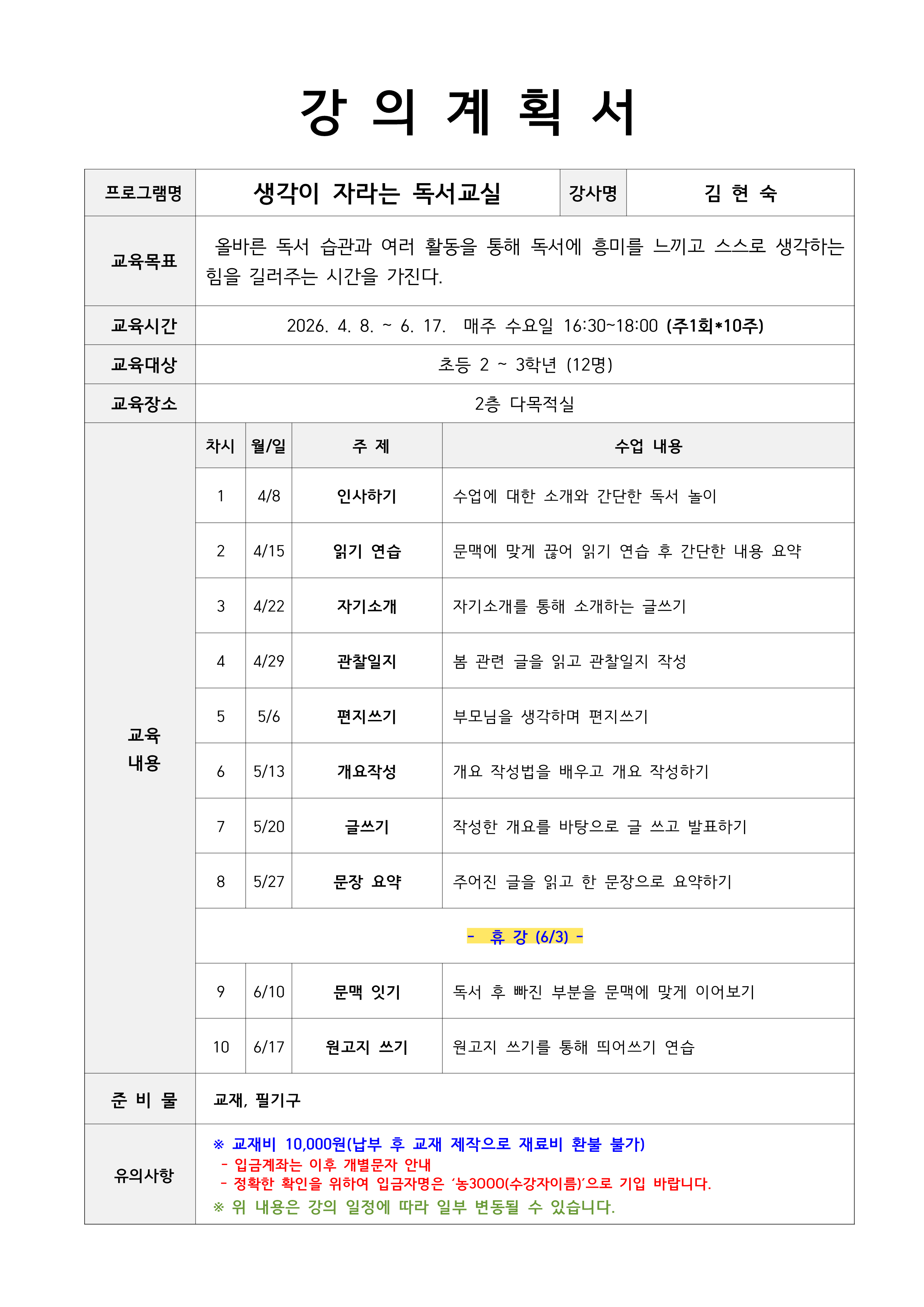 | 생각이 자라는 독서교실 (초등 2~3학년) 기간종료 |