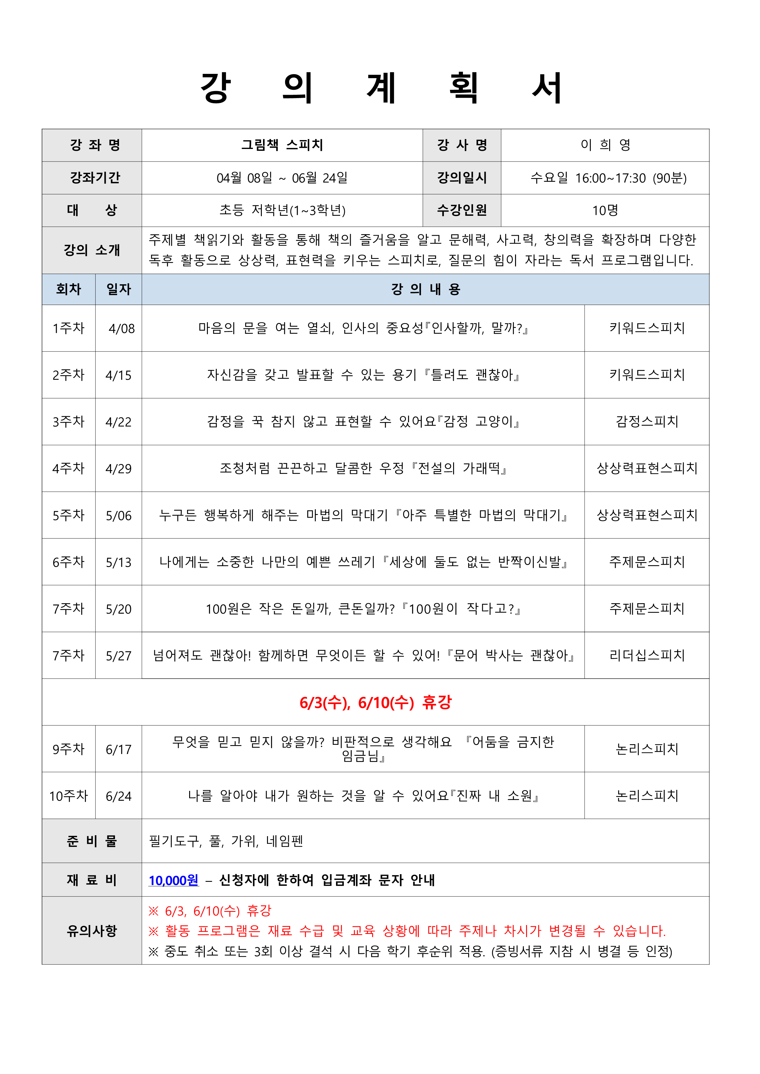 | (추가모집)[정원 6명 / 대기 5명] 그림책 스피치 (초등 1~3학년) 기간종료 |